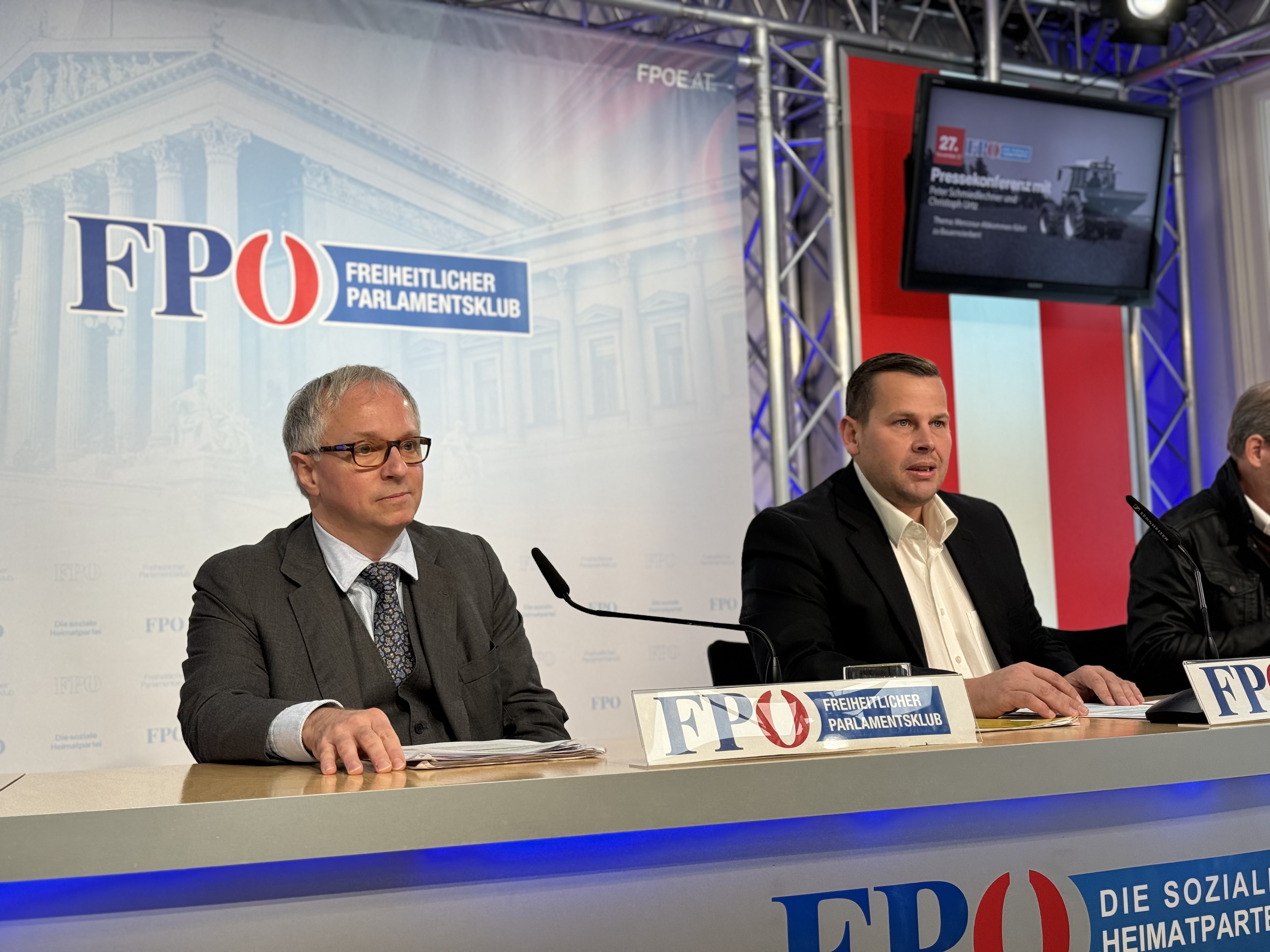 Univ.-Prof. MMag. Dr. Christoph Urtz (l.) und FPÖ-Agrarsprecher Peter Schmiedlechner bei ihrer Pressekonferenz in Wien.